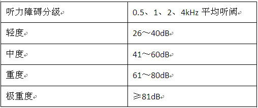 世界卫生组织(WHO1997)听力障碍根据500、1000、2000及4000Hz 气导的平均听阈进行分级。